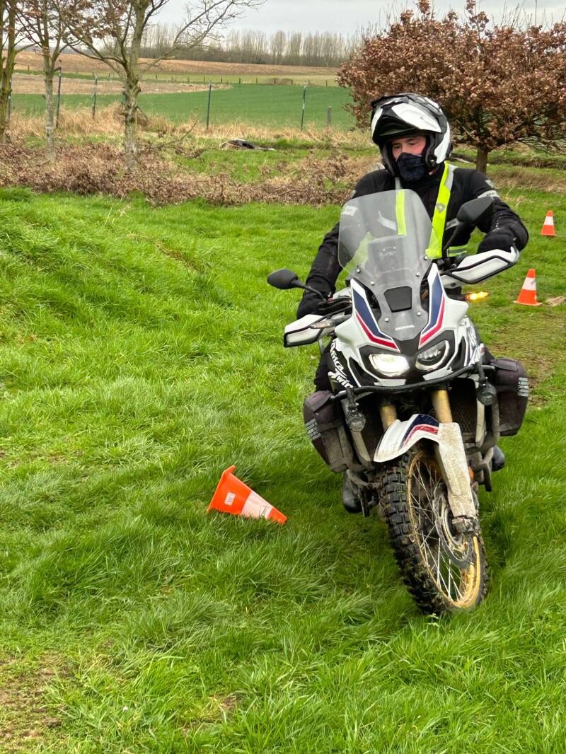De volgende uren gaan we zoveel mogelijk omzetten in de praktijk met verschillende oefeningen offroad, hellingen op en af rijden, kort draaien, rechtstaan of zitten, door water rijden, stoppen en draaien op helling,...